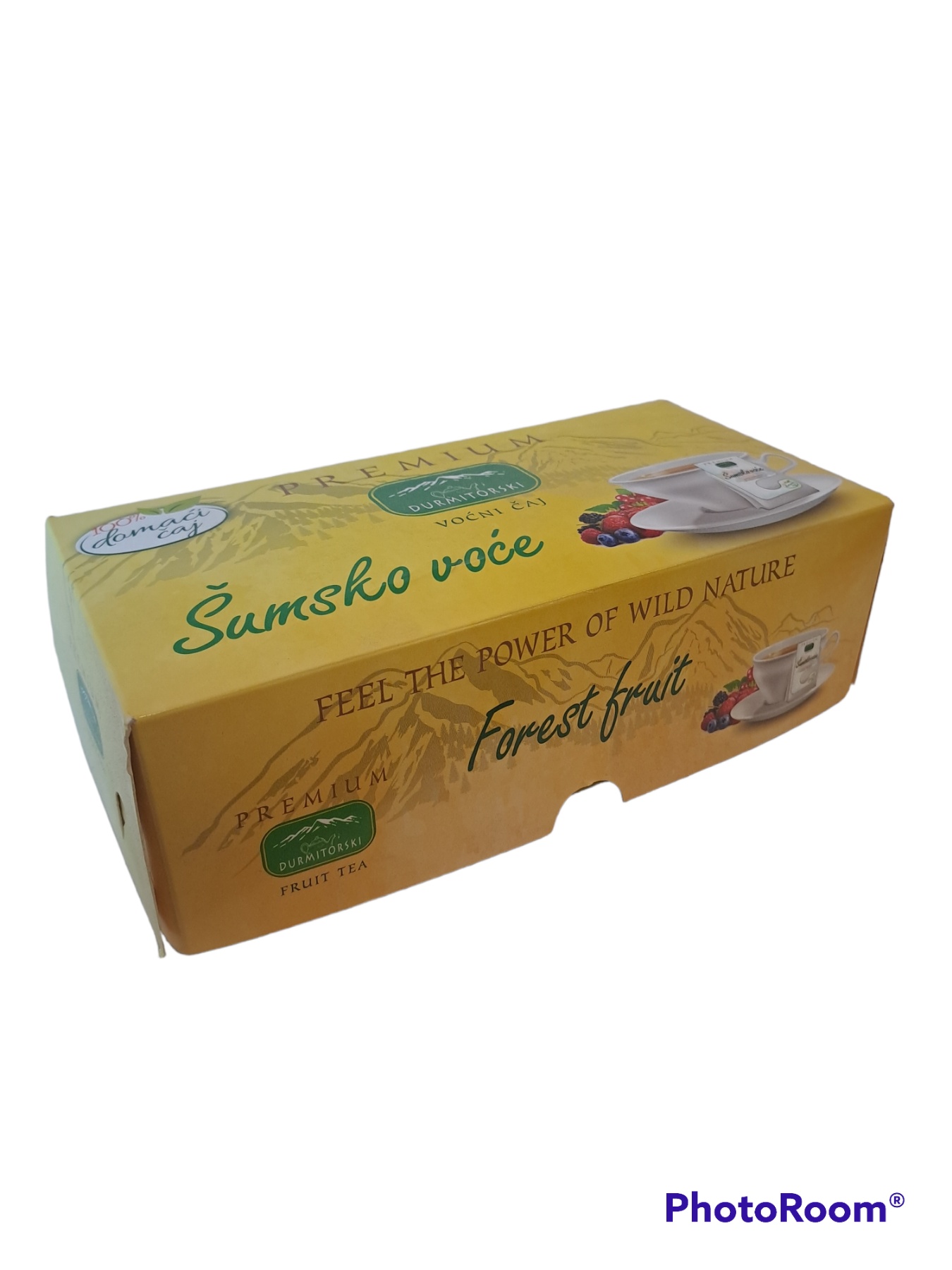Mješavina voćnog čaja sa područja Durmitora. Sastojci: mješavina divljeg voća sa područja Durmitora - 100% (30 filter kesica po 2 gr.)
